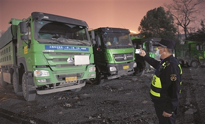 | 执法队员检查工程车是否违规 |