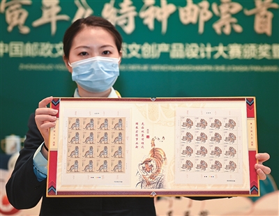 1月5日,一位工作人员在北京邮票首发式现场展示《壬寅年》特种邮票。