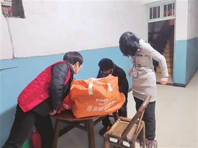| 村委会为老夏(中)一家送上过冬衣服和日用品 |
