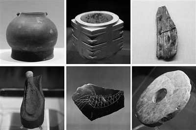 | 从左上起,顺时针方向依次为良渚文化遗址出土的黑陶器、玉琮、木屐、漆器、陶片和玉璧 新华社 翁忻旸 摄 |