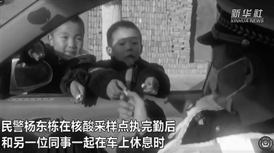 近日,陕西子长民警杨东栋在核酸采样点执完勤后,和同事在车上休息,两名小朋友突然跑过来给他们塞糖,并嘱咐“你们俩一人一个”,再三回绝后,小朋友说:“给你拿你就吃!”把糖塞在民警手里就跑了,场面既朴实又暖心。