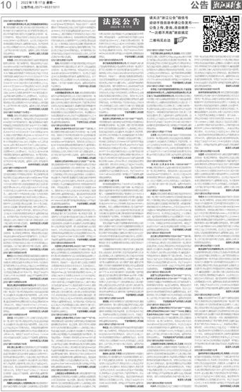 (2021)浙0291民初2599号 边江涛(公民身份号码6103241992****281X):本院受理原告中国人民财产保险股份有限公司宁波市分公司与被告边江涛保险人代位求偿权纠纷一案,因你无法通过其他方式送达,现依法向你公告送达起诉状及证据副本、应诉通知书、举证通知书、开庭传票、告知独任审判人员通知书、诉讼须知、诉讼风险提示书、廉政监督卡、外网查询告知书、强制执行若干意见等材料。自本公告发出之日起经过30日即视为送达,提出答辩状和举证的期限均为公告送达期满后的15日内。并定于2022年3月8日9时00分在本院第一法庭公开开庭审理,逾期将依法缺席判决。宁波高新技术产业开发区人民法院(2021)浙0291民初2263号 赵朋飞(公民身份号码4127241992****2111)、耿利利(公民身份号码4127241991****1122):本院受理原告宁波矗立汽车销售服务有限公司与被告赵朋飞、耿利利服务合同纠纷一案,现已审理终结。现依法向你方送达(2021)浙0291民初2263号民事判决书。自公告之日起30日内来本院领取民事判决书,逾期即视为送达。如不服本判决,可在公告期满后15日内,向本院递交上诉状及副本,上诉于浙江省宁波市中级人民法院。逾期本判决即发生法律效力。宁波高新技术产业开发区人民法院(2021)浙0291民初2225号 谭国亮(公民身份号码3707241980****2092)、冯琴(公民身份号码6228011962****0449)、田婕(公民身份号码6228011988****0444):本院受理原告宁波市盛和担保有限公司与被告谭国亮、冯琴、田婕服务合同纠纷一案,现已审理终结。现依法向你方送达(2021)浙0291民初2225民事判决书。自公告之日起30日内来本院领取民事判决书,逾期即视为送达。如不服本判决,可在公告期满后15日内,向本院递交上诉状及副本,上诉于浙江省宁波市中级人民法院。逾期本判决即发生法律效力。宁波高新技术产业开发区人民法院