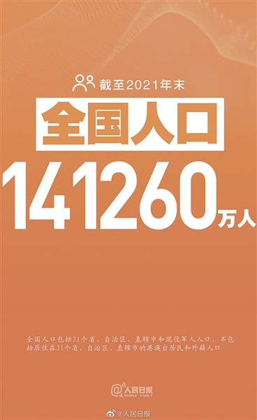 截至2021年末,全国人口(包括31个省、自治区、直辖市和现役军人人口,不包括居住在31个省、自治区、直辖市的港澳台居民和外籍人口)141260万人,比上年末增加48万人。