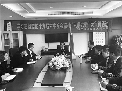 近日,温岭法院石陈法庭庭长陈泳滨来到温岭农村商业银行股份有限公司石塘支行,宣讲党的十九届六中全会精神。