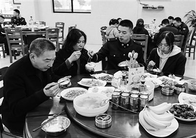 开饭啦!几名新消防员吃到了几道味道熟悉的菜肴,“这菜的味道和我妈做的一样哎”……消防站领导适时聊起了“家”的话题,新消防员的话匣子一下子打开了,“很久没见爸爸妈妈了,快过年了,真想他们呀”“希望爸妈在新的一年里健健康康,他们是我最坚强的后盾”……