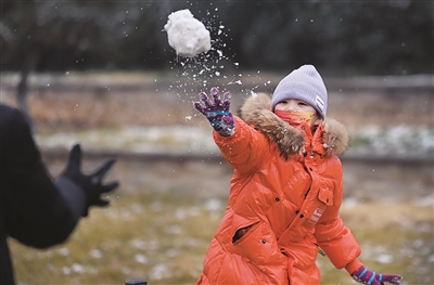 1月23日,小朋友在街头与家人打雪仗。