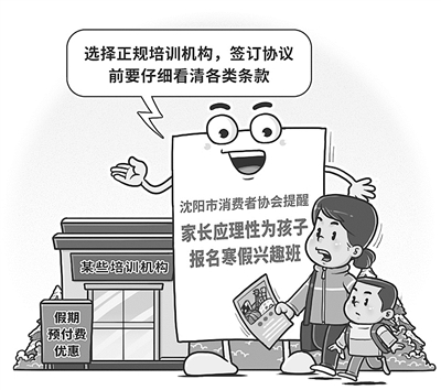 寒假到来,各类课外兴趣班成为消费热点。沈阳市消费者协会提醒,家长为孩子报名寒假兴趣班一定要理性消费,选择正规培训机构,签订协议前要仔细看清各类条款,避免遭遇“报班容易退费难”的情况。