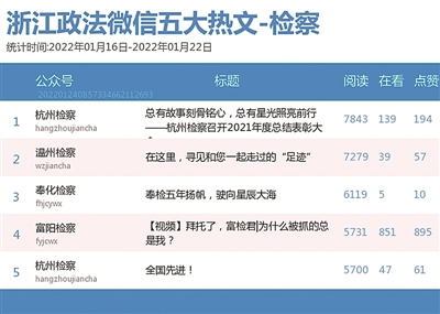 本期检察院榜中,“杭州检察”依旧给力,一举收获两个榜单榜首。热文榜中,《总有故事刻骨铭心,总有星光照亮前行——杭州检察召开2021年度总结表彰大会》获得最多关注,由此可见,先进榜样的力量总能振奋人心!