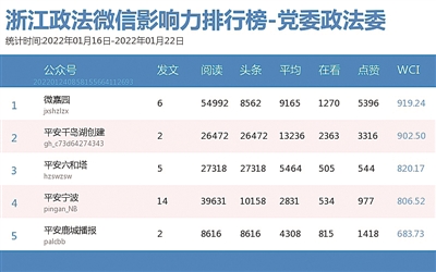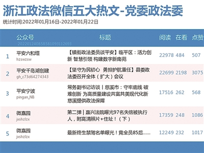 本期政法委榜单,“微嘉园”拔得头筹。该公众号有5篇推文跻身热文榜前十,是本周当之无愧的“实力担当”。