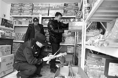 走进仓库,检查人员一边浏览仓库巡查记录,一边查看烟花爆竹的堆放是否符合要求。“存储烟花爆竹有严格要求,必须离地0.12米以上,叠放最高不得超过2.5米,每个堆放区域的间距要在0.30米以上,且仓库要保持合适的温度和湿度,每天早、中、晚检测3次。”检查人员告诉记者。