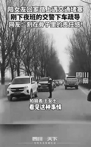 2月5日,河南南阳,一位交警刚刚下夜班,在陪女友回家路上遇上堵车,他立马换衣下车疏导交通。网友:刻在骨子里的责任感!