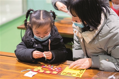 2月6日,小朋友和家长在太原市图书馆参加“巧手迎新春”手工DIY活动。