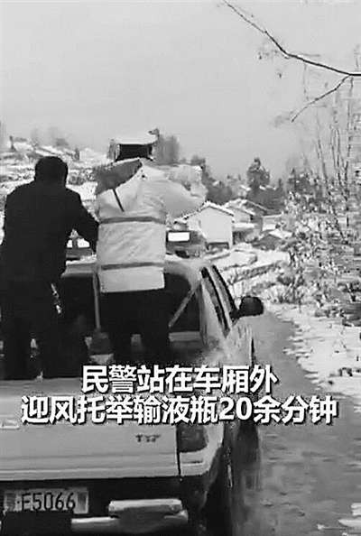 7日11时,湖北宜昌秭归水田坝派出所接到报警,村民王某突发脑梗,民警迅速联系医护人员并前往现场,众人合力将病人抬上警车。为避免车内打吊针引起回血,民警站在车厢外迎风冒雪托举输液瓶20多分钟,直至病人安全转移到救护车上。