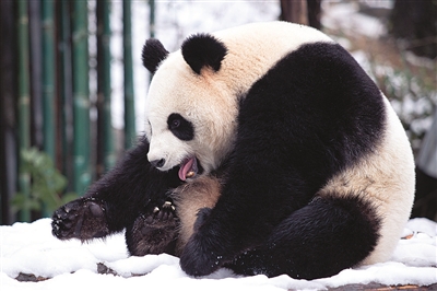 一场降雪过后,南京红山森林动物园的大熊猫在雪地里玩耍,享受降雪带来的乐趣。