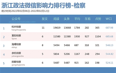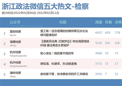 本期检察院榜,前三名依次是“杭州检察”“富阳检察”“海曙检察”。热文榜上,“富阳检察”的《复工啦!这份疫情防控期间常见涉企法律问题请收好》一文,通过“快问快答”形式,帮助企业和劳动者及时了解疫情防控政策和涉企法律问题。