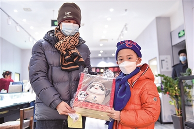 2月14日,顾客向记者展示取到的“冰墩墩”毛绒玩具。