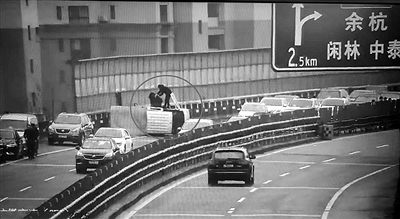画面中,两名黑衣男子站在车顶,把被困人员从侧翻的车内接出。紧接着,一人对主线车流进行疏导,另一人把车子周边的木板、杂物清出车道。