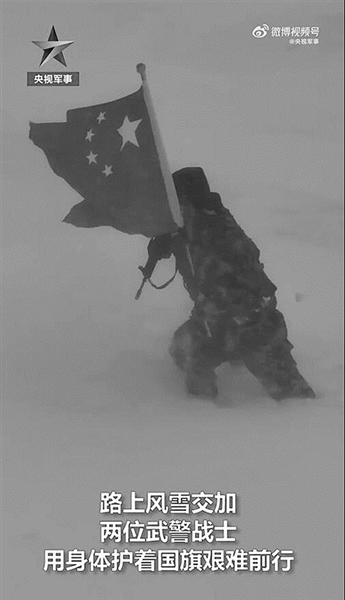 15日晨,中哈边境武警兵团总队执勤第五支队的官兵结束巡逻后,高举国旗返回营区。路上风雪交加,两位武警战士用身体护着国旗艰难前行。风再大、路再难也要护国旗高擎不倒,辛苦了,致敬!