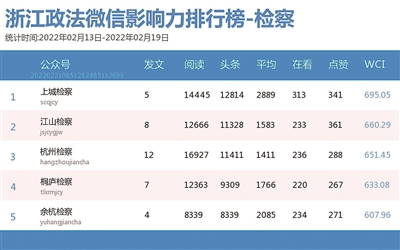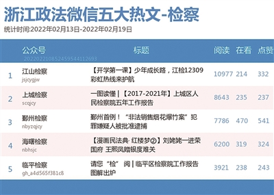 本期检察院篇,前三名依次为“上城检察”“江山检察”“杭州检察”。热文榜上,“江山检察”《【开学第一课】少年成长路,江检12309彩虹热线来护航》一文,分享了未成年人保护的相关法律知识,居于榜首。