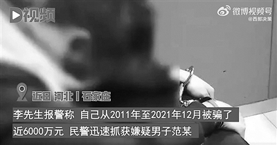 近日,河北石家庄的李先生报警称,他从2011年至2021年12月被骗了近6000万元,民警迅速抓获嫌疑男子范某。经查,范某骗李先生做慈善,李先生前后向范某转账100多万元。2013年,范某谎称央视要宣传李先生,事后李先生能得到3000万元,又骗取了李先生1000多万元。直到范某称,纪录片拍摄出现纠纷,要到美国打官司还要送礼,李先生才意识被骗,但此时他已被骗近6000万元。期间,范某将诈骗得来的赃款全部用于打赏网络主播、酒吧消费、购买奢侈品等,将赃款几乎全部挥霍。目前,范某已被刑拘,案件正在侦办中。