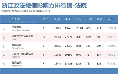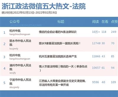 本期法院篇,“杭州中院”凭借一条阅读量达10万+的热文,牢牢守住“双料冠军”宝座。2月14日,该公号推出《情侣约会前必看的N条法律知识》一文,广获好评,有网友留言称该文为“情人节法律必修课”。