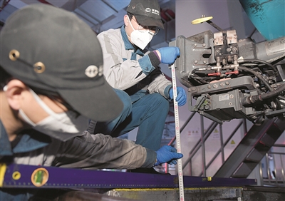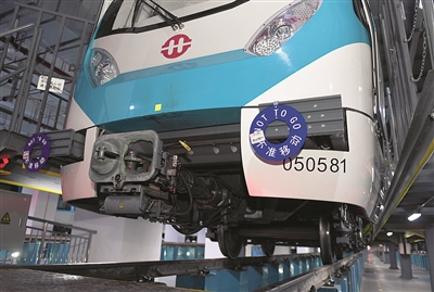 徐旭锋介绍,这辆列车正在“B检”,一般每月检查一次,“B检”相当于汽车的大保养,维修员除对各零部件上的标线进行目测外,还会使用一系列工具,对车轮轮缘高度、厚度、轮径和车钩高度进行测量。
