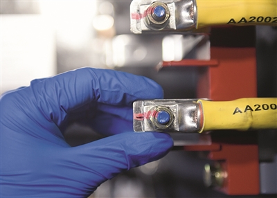 确认各部件没有故障,徐旭锋和侯剑来到地铁下的地沟,对车底各部件进行对位互换检修。在3号车厢底部,徐旭锋和侯剑依次检查了低压箱、辅逆箱和牵引箱,确认电池组电压没有异常后,又对箱体内的每一个螺丝进行检查,“所有螺丝都有标线,一旦移位就说明是松动了,需要立即加固。”