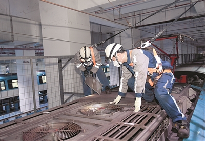 “控制中心,1号股道作业区已断电,申请进入。”维修员徐旭锋和侯剑熟练地来到列车车顶进行检查。