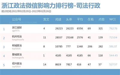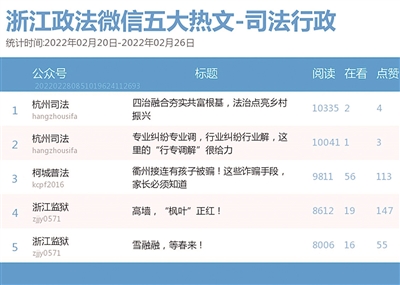本期司法行政榜,“浙江监狱”依旧稳坐首位,“杭州司法”紧随其后。热文榜上,“杭州司法”略胜一筹,《四治融合夯实共富根基,法治点亮乡村振兴》《专业纠纷专业调,行业纠纷行业解,这里的“行专调解”很给力》两篇阅读数过万的文章都出自“杭州司法”。