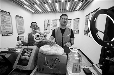 | 杭州市临安区湍口镇三联村党总支书记方刚(右)和党员志愿者在村里直播间展示当地特色农产品(2021年8月13日摄) 新华社 徐昱 摄 |