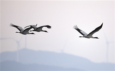 3月8日,黑颈鹤在贵州草海国家级自然保护区上空飞翔。