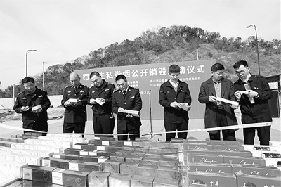 3月10日,岱山县公安局与舟山海关、县烟草专卖局等部门联合举行罚没走私卷烟公开销毁活动,采取焚烧发电的方式,将走私卷烟“变废为宝”,集中销毁假烟22.735万条,可直接发电约18000度。此次集中销毁的走私卷烟涉及“中华(硬出口)”“555(金)免税”“红双喜”“米兰”等品牌,价值约3000万元。