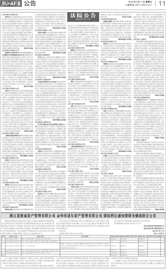 (2021)浙1081民初11215号 何先聪:本院受理原告梁碧统诉你方民间借贷纠纷一案。因你下落不明,其他方式已无法送达,依照《中华人民共和国民事诉讼法》第九十五条的规定,向你公告送达本院(2021)浙1081民初11215号民事裁定书之一。裁定如下:准许原告梁碧统撤诉。案件受理费923元,减半收取461.50元,公告费560元,合计1021.50元,由原告梁碧统负担。本公告自发出之日起,经过三十日即视为送达。温岭市人民法院(2021)浙1127破5号 本院根据毛金钱、毛炜勇、毛炜烨、王世英的申请于2022年1月7日裁定受理景宁金色海湾洗浴有限公司破产清算一案,并于同日指定丽水万邦天义会计师事务所有限公司为景宁金色海湾洗浴有限公司的管理人。景宁金色海湾洗浴有限公司的债权人应在2022年4月8日前向管理人申报债权(通信地址:浙江省丽水市莲都区北苑路198号万地财富大厦A座6楼;邮政编码:323000;联系人:魏巍;联系电话:13757092023),并书面说明债权数额、有无财产担保及是否属于连带债权,以及提供相关证据材料。未在上述期限内申报债权的,可以在破产财产分配方案提交债权人会议讨论前补充申报,但要承担为审查和确认补充申报债权所产生的费用。未申报债权的,不得依照《中华人民共和国企业破产法》规定的程序行使权利。景宁金色海湾洗浴有限公司的债务人或者财产持有人应当向管理人清偿债务或交付财产。 本院定于2022年4月15日上午9时在本院第七号法庭召开第一次债权人会议。依法申报债权的债权人有权参加债权人会议。参加会议的债权人系法人或其他组织的,应提交营业执照、法定代表人或负责人身份证明书,如委托代理人出席会议,应提交身份证件或律师执业证,委托代理人是律师的,还应提交律师事务所的指派函。参加会议的债权人系自然人的,应提交个人身份证明。如委托代理人出席会议,应提交特别授权委托书、委托代理人的身份证件或律师执业证,委托代理人是律师的还应提交律师事务所的指派函。景宁畲族自治县人民法院(2022)浙1124破5号 本院依据松阳县政策性融资担保有限公司的申请,于2022年1月21日依法受理浙江德力钢业有限公司破产清算一案,并于2022年2月9日指定丽水佳信会计事务所有限公司担任管理人。浙江德力钢业有限公司的债权人应在2022年4月10日前,向管理人申报债权(通讯地址:浙江省丽水市莲都区人民街403号二楼;邮政编码:323000;联系人:朱泽毅;联系电话:13606690333),书面说明债权数额、有无财产担保及是否属于连带债权,并提供相关证据材料。未在上述期限内申报债权的,可以在破产财产分配方案提交债权人会议讨论前补充申报,但要承担为审查和确认补充申报债权所产生的费用。未申报债权的,不得依照《中华人民共和国企业破产法》规定的程序行使权利。浙江德力钢业有限公司的债务人或财产持有人应当向管理人清偿债务或交付财产。第一次债权人会议将于2022年4月14日上午9时30分在本院第十号审判庭召开。依法申报债权的债权人为债权人会议的成员,有权参加债权人会议。参加会议的债权人系法人或其他组织的,应提交营业执照、法定代表人或负责人身份证明书,如委托代理人出席会议,应提交特别授权委托书、委托代理人身份证件或律师执业证,委托代理人为律师的,还应提交律师事务所的指派函。债权人系自然人的,应提交个人身份证明。如委托代理人出席会议,应提交特别授权委托书、委托代理人身份证件或律师执业证,委托代理人为律师的,还应提交律师事务所的指派函。松阳县人民法院