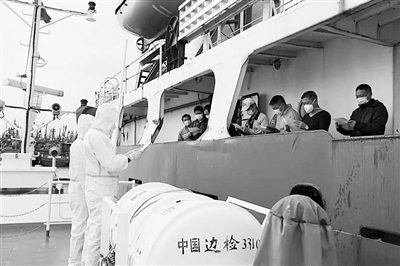 近段时间,台州出入境边防检查站民警立足辖区管控特点,提高海上巡逻密度,加大船舶检查频度,全力织密海上安全防护网。图为边检民警向远洋渔船宣讲口岸疫情政策。