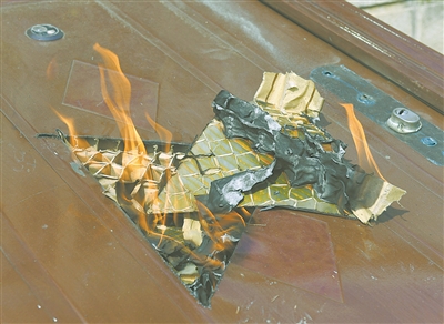 而普通防盗门切开后,露出的竟是蜂窝状纸板,用手轻轻一扯,纸板就被撕下。用喷枪点火,火势不但将裸露的纸板全部引燃,还开始向门体的夹层蔓延,观看直播的网友惊呼“想不到”。