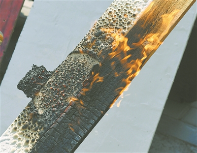 而涂有防火涂料的木材表面,虽然喷火后有气泡出现,但拿掉喷枪、抠掉表面焦层,板材内部没有碳化。