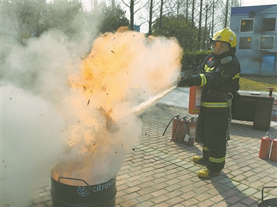 消防员又点燃一个油桶,待火势猛烈燃烧后,使用合格灭火器灭火,火势很快被扑灭,油桶上方升起白烟。