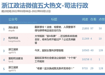 司法行政榜上,老将“浙江监狱”持续霸榜,“黑马”“洞头普法”也有亮眼表现。该公众号《最新禁令!法官、检察官、人民警察不得与律师有这些交往行为》一文以21893的阅读数拿下热文榜第一,该文罗列了法官、检察官、人民警察与律师之间严禁出现的接触交往行为,筑牢清廉司法防线。
