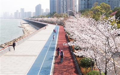 3月15日,杭州钱塘江边跑道旁的1800多株樱花次第绽放,进入最佳观赏期,吸引不少市民前来赏樱。