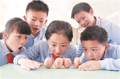 3月17日,东阳市外国语小学四(2)班的学生们体验“立蛋”游戏。春分将至,该校开展“立蛋迎春分”主题民俗活动,让学生通过绘彩蛋、立蛋等活动,体验传统民俗,感受中国传统文化。包康轩 潘丽丹