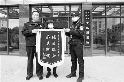 本报讯 日前,义乌市大陈镇楂林二村村民宣女士来到大陈派出所,送上了一面绣有“优质服务 为民解忧”字样的锦旗。