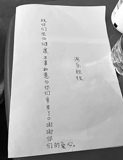 闻先生一家就住在执勤点附近。几日下来,他和孩子将执勤人员的辛苦付出看在眼里,于是小朋友用自己的方式表达了感谢,“祝你们生(身)体健康,万事如意。你们辛苦了,谢谢你们的爱心。”字很稚嫩,还有错别字,但收到礼物的民警心里暖暖的。