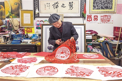 3月20日,浙江省非物质文化温岭剪纸传承人林荣文正在创作杭州亚运会主题剪纸,为即将到来的亚运会添彩。