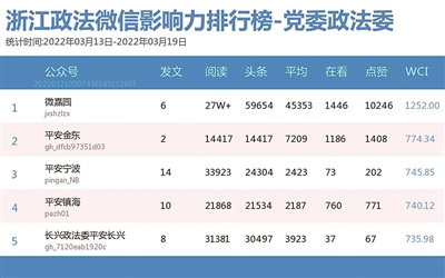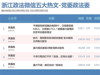 本期政法委榜上,“微嘉园”势头强劲,以27W+的阅读量获得第一。热文榜上,该公众号更是有6篇推文跻身前十。值得一提的是,本次阅读量高的推文均与疫情有关,一篇篇讲述抗疫故事的文章展现了各部门团结一心、众志成城的“群像”。