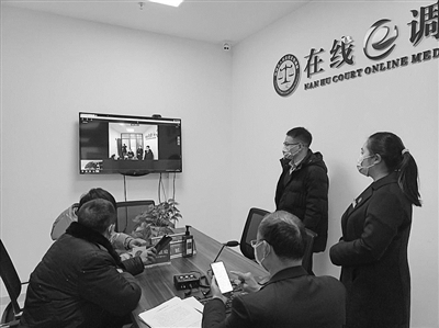 在矛调中心二楼的ODR调解室内,王建龙与当事人通过ODR系统进行“面对面”视频调解。在王建龙的分析劝导下,双方当事人约定了还款时间,完成了相关文书材料的远程递交,达成调解协议后,再通过系统直接提交南湖区法院司法确认。这套在线调解全流程下来,成功将这起纠纷化解于诉前。
