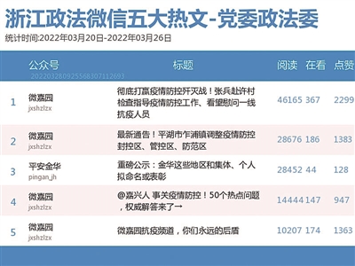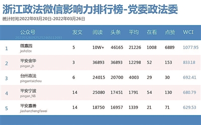 本期政法委榜,“微嘉园”依旧稳居第一宝座。热文榜上,“微嘉园”共有4篇热文挤进榜单前5,实力不容小觑。