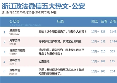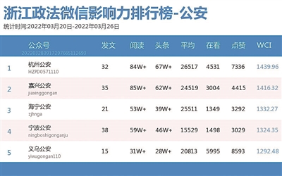 本期公安榜竞争激烈,“杭州公安”以微弱优势位列榜单第一,“嘉兴公安”“海宁公安”紧随其后。热文榜上,“温州交警”的《重磅!这个项目签约了,与每个人有关!》一文获得第一名,值得一提的是,本次榜单前5阅读量均破10万。
