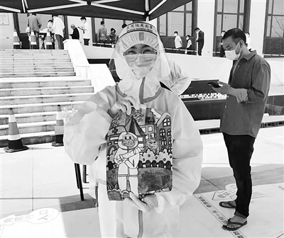 “大白,我可以和你合影吗?”衢州柯城法院干警王璐忙着维持核酸检测队伍秩序时,一个小朋友怯生生地问她。当时正是检测高峰期,她轻声告诉小朋友,稍等一会儿。“我还有一幅画要送给你们,谢谢你们!辛苦啦!”得到回应的小朋友高兴不已,马上从背后拿出一幅画,喜滋滋地举到王璐面前。王璐的疲惫顿时烟消云散。