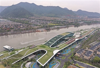富阳水上运动中心建筑以“山”为形,体现黄公望画卷中的“山”元素;景观以“水”为韵,通过流畅的铺装线条来体现“水”文化,被国家赛艇协会称赞为“史上最美”赛艇比赛场地。场馆在满足亚运赛事同时,赛后将改造为水上运动休闲为主题的特色酒店,同时保留部分体育功能,设置赛艇皮划艇体验中心,充分发挥赛后利用功能及效益。