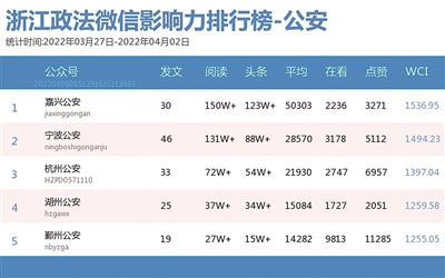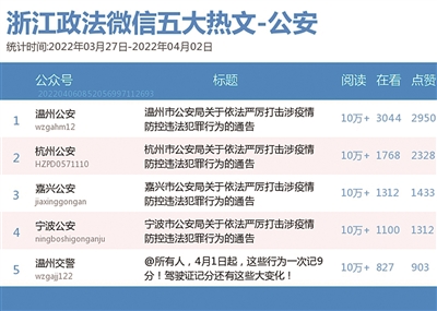 本期公安榜,“嘉兴公安”跃居榜首。热文榜上,“温州公安”《温州市公安局关于依法严厉打击涉疫情防控违法犯罪行为的通告》凭借“10万+”阅读量、3044在看数,稳居第一。